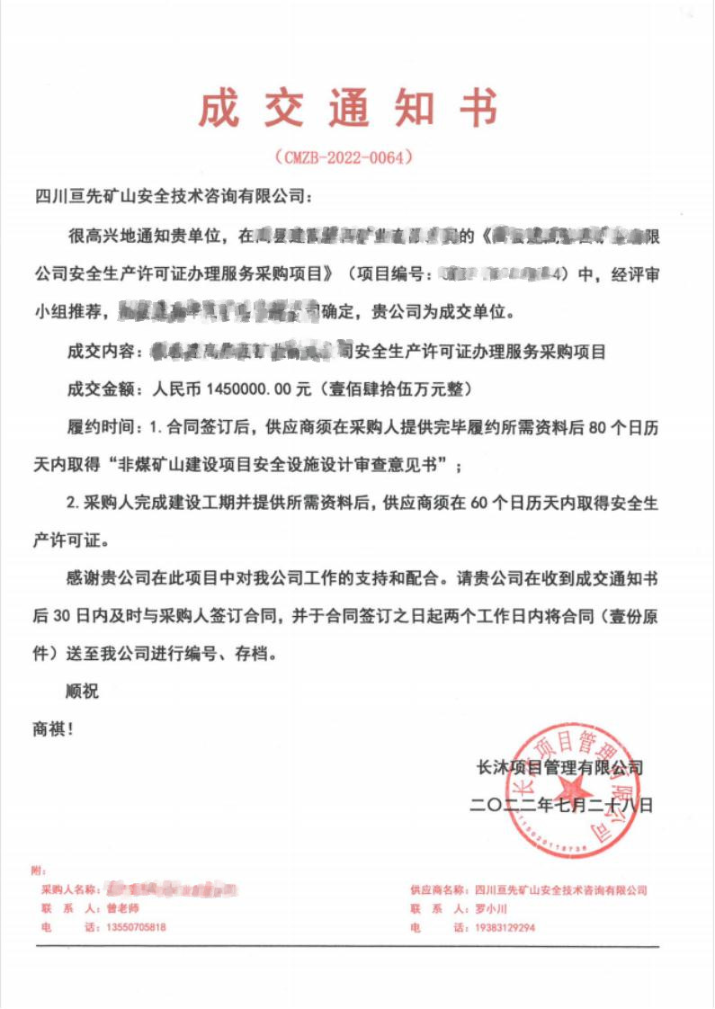 热烈祝贺我司在“高县建高华西矿业有限公司安全生产许可证办理服务采购项目(项目编号:CMZB-2022-0064)”招标中,与众多竞争对手的角逐下脱颖而出,一举标中。